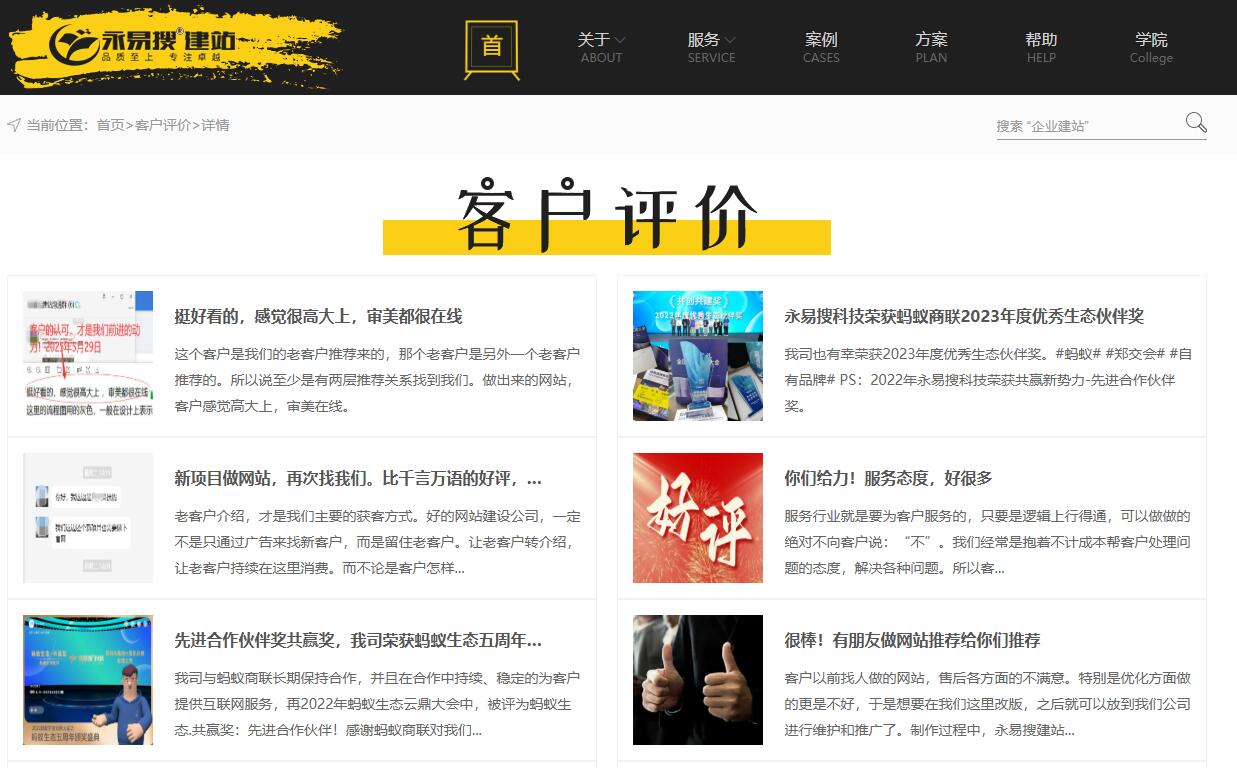 也有客户说永易搜建站做的网站很好看,审美好很多。漂亮大气,又有内涵的网站,肯定是大家想要的。服务行业就是要为客户服务的,只要是逻辑上行得通,可以做做的绝对不向客户说:“不”。我们经常是抱着不计成本帮客户处理问题的态度,解决各种问题。所以客户能够感知到不同的服务差异。